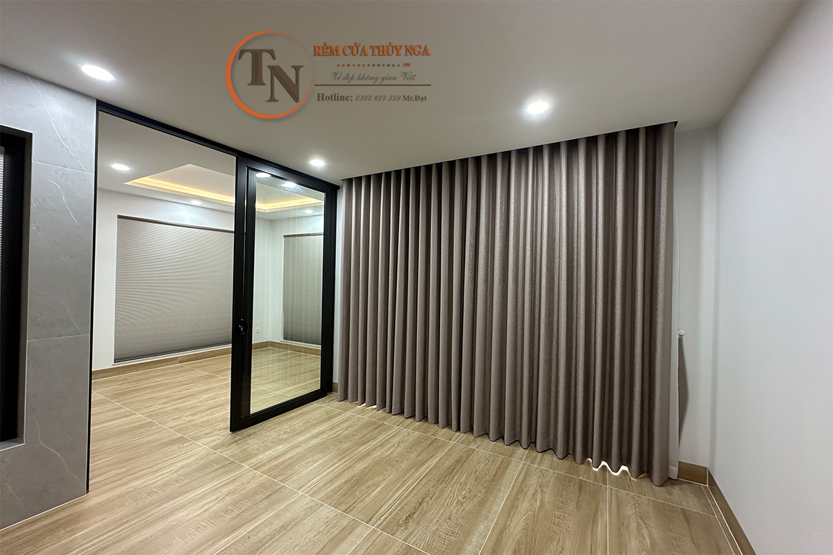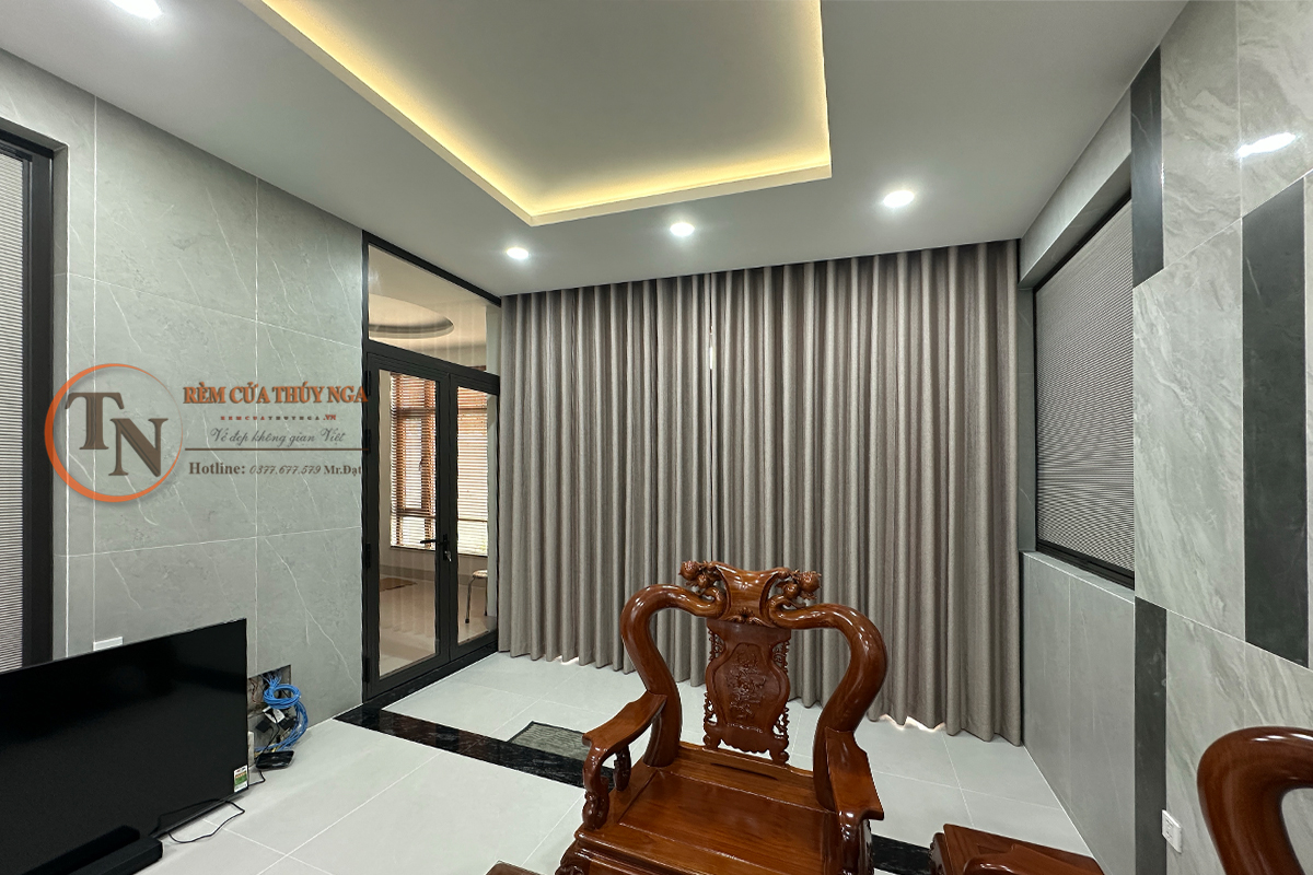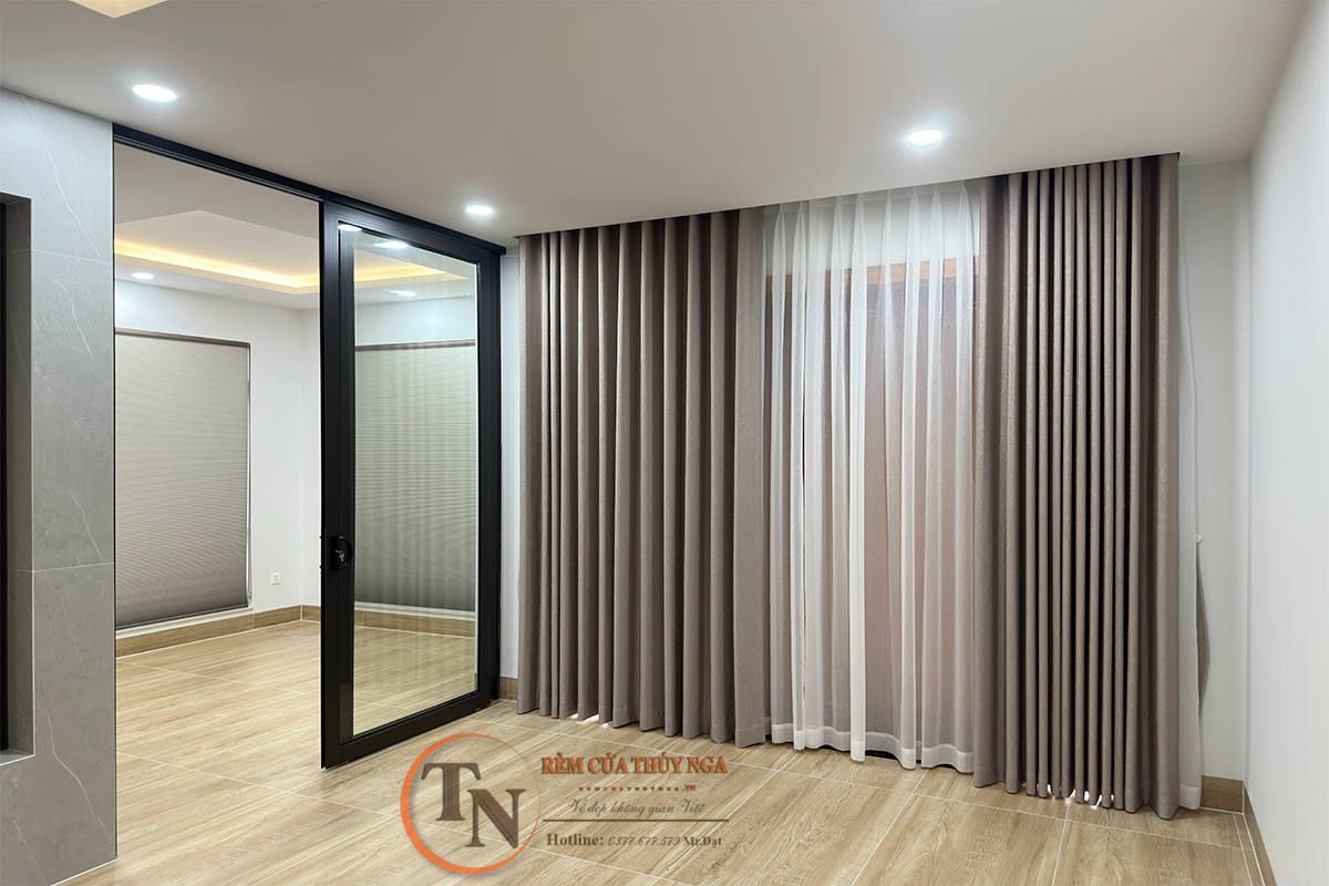 Tại cửa chính phòng khách và cửa chính phòng ngủ của nhà chú Thành, rèm vải Depo được lựa chọn để tạo nên sự sang trọng và ấm cúng. Tông màu trung tính giúp không gian trở nên tinh tế, phù hợp với nội thất hiện đại.
